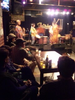 トミアジライブatプレアデス。今夜は、福岡のアフリコモと、東京からMURPHYの二組を迎えてのイベント。まずは満員御礼に感謝です!1番手を華やかに飾ってくれたアフリコモ(写真:手ブレでゴメン)。女の子だけのアフリカンパーカッションチーム。すんごい良かった。母性の様なグルーブに、柔らかい唄としなやかなダンス。筆者、ファンになってもた。
